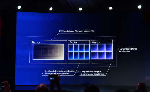 作为高通AI引擎核心的高通Hexagon NPU此次也迎来了一系列升级,拥有6个核心向量加速器,8个核心标量加速器,并且所有核心的吞吐能力都更强了。同时,高通也加强了Tensor张量加速器与其他功能,更好地支持大语言(LLM)和大视觉(LVM等AI模型、超长文本等应用。另外,高通提升了并发特性,AI与计算视觉负载可以共存在NPU内存。