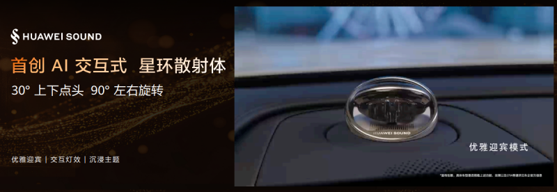 星环散射体一直是HUAWEI SOUND的一大技术亮点,每当用户落座时,水晶星环散射体就会自动升起迎宾,氛围灯还会随声音律动,其散射体结构让高音清亮有层次,中音浑厚有细节,带来极致奢享的听觉与视觉盛宴。本次大会上,HUAWEI SOUND带来了行业首创的AI交互式星环散射体,它支持左右转向、上下点头,能迎宾、有交互灯语和专属沉浸主题,是声学、美学与座舱小艺智能的完美结合。AI交互式星环散射体将会在启境GT7上与用户率先见面。