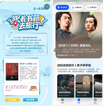 4月13日-5月10日期间,花瓣地图联合华为音乐、华为视频、华为阅读三大应用,推出 “跟着音乐/视频/书籍去旅行”主题活动。以一首歌、一部剧、一本书为向导,一键跳转导航,让影音书香带你真正走进一座城市。