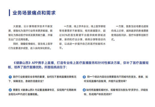 在前期充分的需求调研基础上,上直播为健康山西APP打造针对性的直播解决方案,助力3年内完成2000多场直播,覆盖山西省百万医患群体,让越来越多的医生实现线上讲课输出、技能培训。